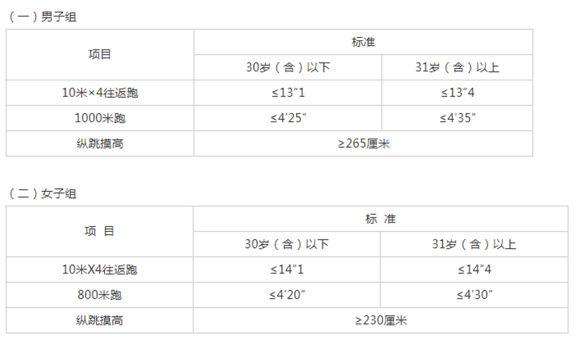 體能測評:不同省市有所區(qū)別,有的先體能再面試(如浙江、山東、北京等);有的先面試后體能(如上海、云南等地,根據(jù)崗位人數(shù)按照1:2的比例,按照綜合成績高低,進行體能測評)。