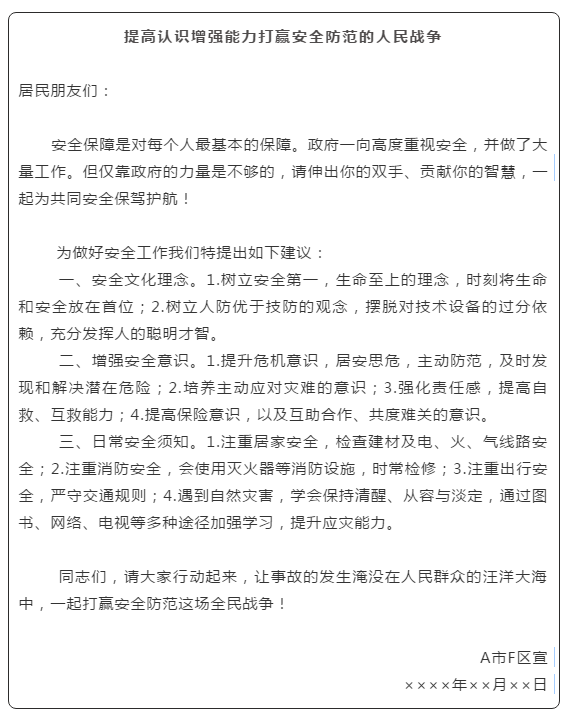 結語:這個段落主要起號召作用。當交代完所要宣傳的內容以后,就要號召宣傳對象來落實踐行所宣傳的內容,這樣的話,宣傳稿才算完整。
