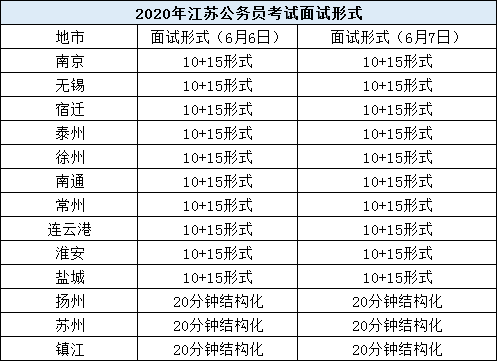 今年采用10+15模式的面試形式比較多,只有揚州、蘇州、鎮(zhèn)江采用的是20分鐘結構化的形式(如下圖):