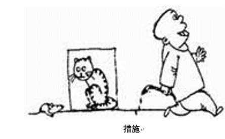 4、漫畫題:地上有一只老鼠,有一個人在墻上畫了一只貓,旁邊寫著“措施”,然后這個人就走了。談談你的看法。