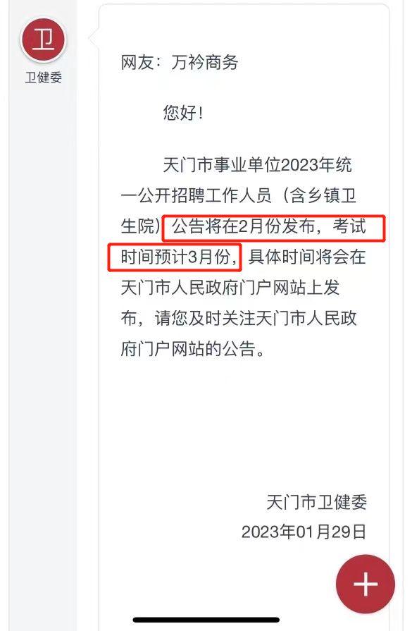 天門衛(wèi)健委回復(fù):天門市事業(yè)單位2023年統(tǒng)一公開招聘工作人員(含鄉(xiāng)鎮(zhèn)衛(wèi)生院)公告將在2月份發(fā)布,考試時(shí)間預(yù)計(jì)3月份……