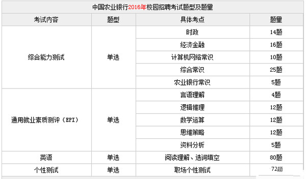 2018中國(guó)農(nóng)業(yè)銀行校園招聘考試內(nèi)容根據(jù)歷年考情來看,中國(guó)農(nóng)業(yè)銀行校招考試內(nèi)容基本變化不大,包括:通用素質(zhì)能力測(cè)試(EPI)、綜合能力測(cè)試、英語(yǔ)、性格測(cè)試。主要是在具體考試項(xiàng)目、題量上有相應(yīng)變化。(以下往年考試科目及題量?jī)H供參考,具體以2018農(nóng)行校園招聘考試為準(zhǔn)。)