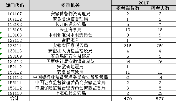 2018國(guó)家公務(wù)員考試職位表(安徽地區(qū))共招聘470崗位,977人。