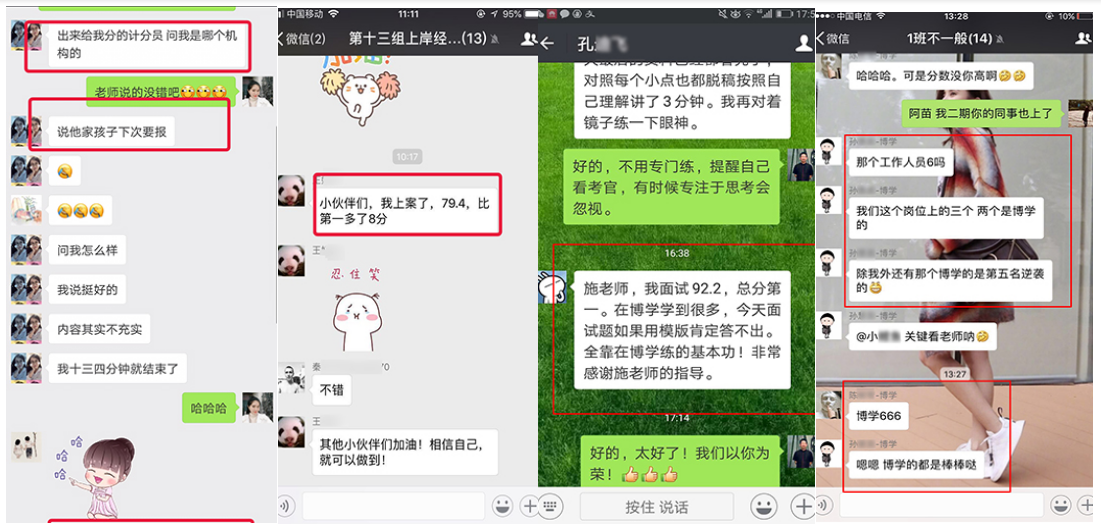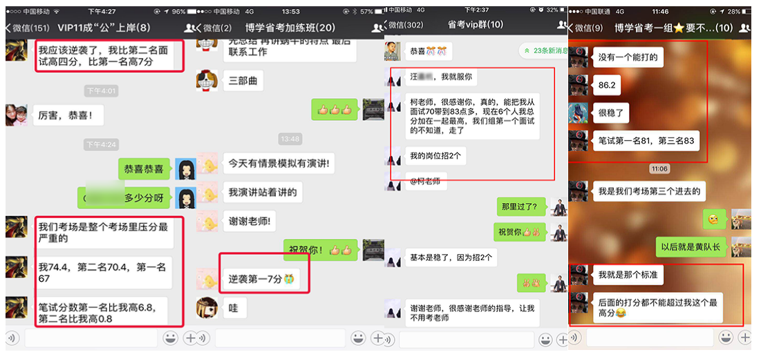 在2010年—2018年國(guó)考中,很多人僅僅是因?yàn)榭戳司W(wǎng)上博學(xué)教育公務(wù)員班的幾段視頻,就毫不猶豫地選擇博學(xué)教育,最終成功地實(shí)現(xiàn)了他們的公務(wù)員之夢(mèng)。2010年安徽省考高陽(yáng)同學(xué)面試取得88.4的高分,一舉從筆試第23名躍居為綜合排名第一名,成為巢湖市面試狀元;胡卓然同學(xué)以86分的成績(jī)勇奪南京市第一名,被南京市國(guó)土資源局錄取。廣東的鄭滋潤(rùn)同學(xué),數(shù)次公考面試失敗,2011年慕名來(lái)到博學(xué)施老師門(mén)下,經(jīng)過(guò)七天學(xué)習(xí),脫胎換骨,以91分的成績(jī)遙遙領(lǐng)先對(duì)手被財(cái)政部駐深圳市專(zhuān)員辦錄??!2011年安徽省考季毓同學(xué)面試取得88的高分,成為馬鞍市面試狀元;2012年上海的潘安安同學(xué),以88.3的高分被上海海關(guān)隸屬海關(guān)通關(guān)業(yè)務(wù)部門(mén)錄取。2013年福建的王子熙同學(xué),以89.4的高分被廈門(mén)海關(guān)廈門(mén)地區(qū)隸屬海關(guān)或辦事處錄取。2013年安徽省考牛園園同學(xué)取得面試86.8分,成為亳州市面試狀元!2014年安徽的曹珍同學(xué),以86.8的成績(jī)勇奪安徽省直面試狀元,被安徽省女子監(jiān)獄錄取。2015年國(guó)考安徽的曹燦同學(xué),以92.25分的成績(jī)被中國(guó)銀行業(yè)監(jiān)督管理委員會(huì)安徽監(jiān)管局錄取!2015年安徽省考陳雯同學(xué)以面試87.2的高分勇奪蕪湖市面試狀元;趙錦同學(xué)以面試86.4的高分取得天長(zhǎng)市面試狀元;查菁文同學(xué)以面試86的高分取得定遠(yuǎn)縣面試狀元。2016年國(guó)考面試,張雨豪以91分的成績(jī)被甘肅省國(guó)家稅務(wù)局錄取。2016年安徽省考陳蓉同學(xué)以面試86.8分取得馬鞍山市非鄉(xiāng)鎮(zhèn)公務(wù)員面試狀元;2017年國(guó)考,劉大偉勇奪山東省面試狀元,以98.67分被商務(wù)部錄??;阮帆同學(xué)面試取得91.33分,上海市國(guó)稅錄取;鄭想同學(xué)面試取得90.3分,上海國(guó)稅錄;2017年安徽省考顧博賢同學(xué)以面試88分取得利辛縣非鄉(xiāng)鎮(zhèn)公務(wù)員面試狀元。2018年國(guó)考徐起以87.33分被中央國(guó)家機(jī)關(guān)工委錄取,夏鈺以88.33分被中國(guó)浦東干部學(xué)院錄取。2018年安徽省考,周陽(yáng)以83.8分取得銅陵市鄉(xiāng)鎮(zhèn)層級(jí)面試狀元;魏宇以82.8分取得亳州市鄉(xiāng)鎮(zhèn)層級(jí)面試狀元!