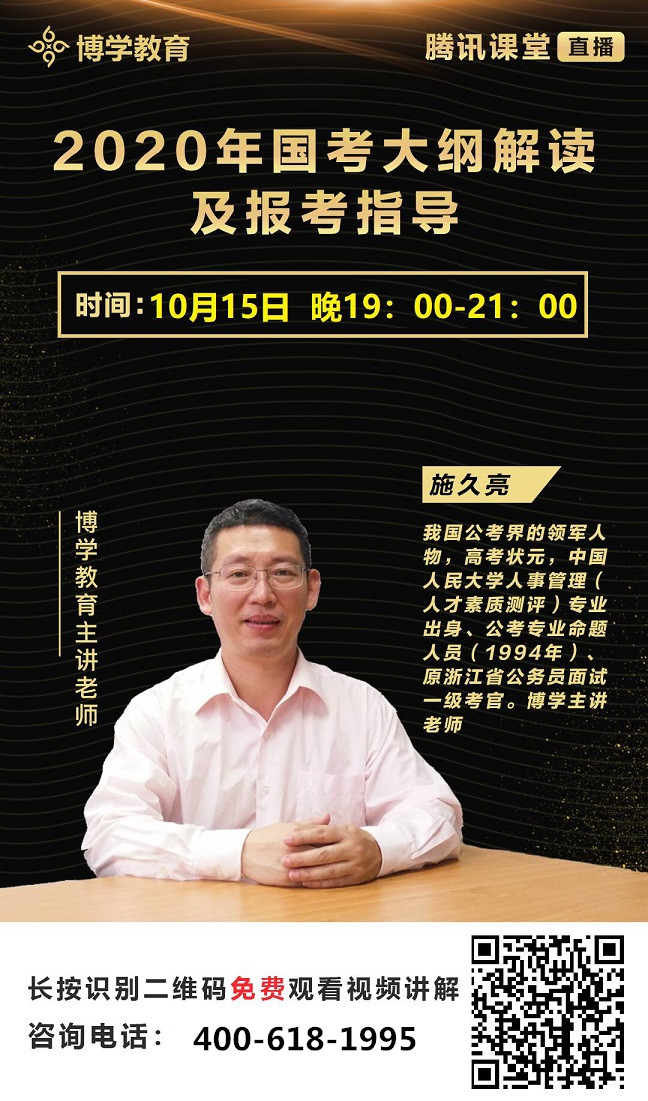為了提高報名和備考的針對性和有效性,請鎖定10月15、16日晚19:00博學(xué)教育首席老師——施久亮老師2020國考報名指導(dǎo)及大綱解讀的騰訊直播課!你想知道的統(tǒng)統(tǒng)都會有,還可以實(shí)時互動!